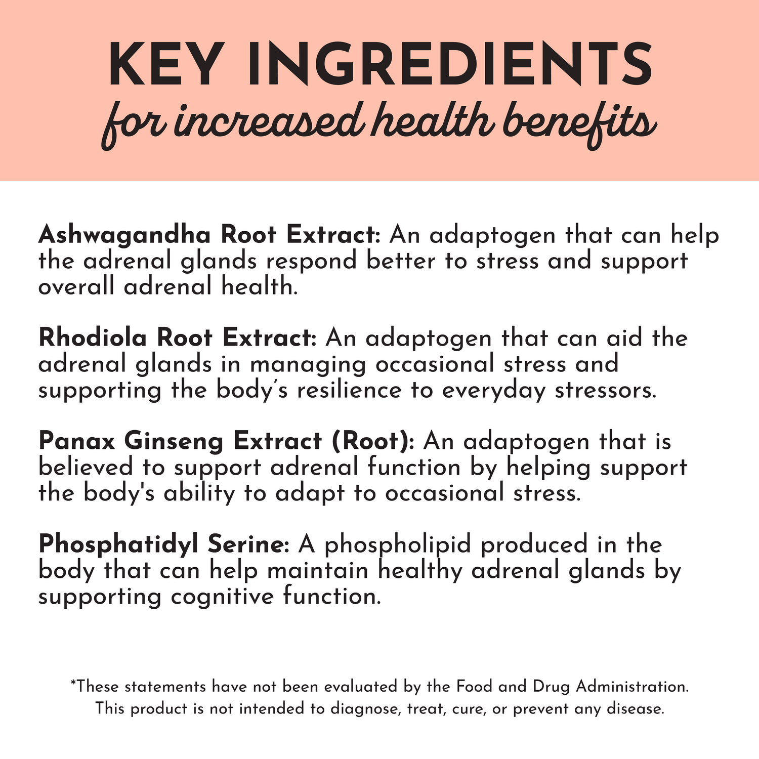Just Ingredients Adrenal Complex is formulated to support the body’s response to everyday stress and occasional fatigue. It features three adaptogens—Ashwagandha, Rhodiola, and Ginseng—each selected to help support adrenal function, hormonal balance, and energy levels. The addition of Phosphatidylserine, a brain-supporting phospholipid, helps support communication between the brain and adrenal glands. This thoughtful combination is designed to promote resilience and cognitive performance, supporting your body through the demands of daily life.*