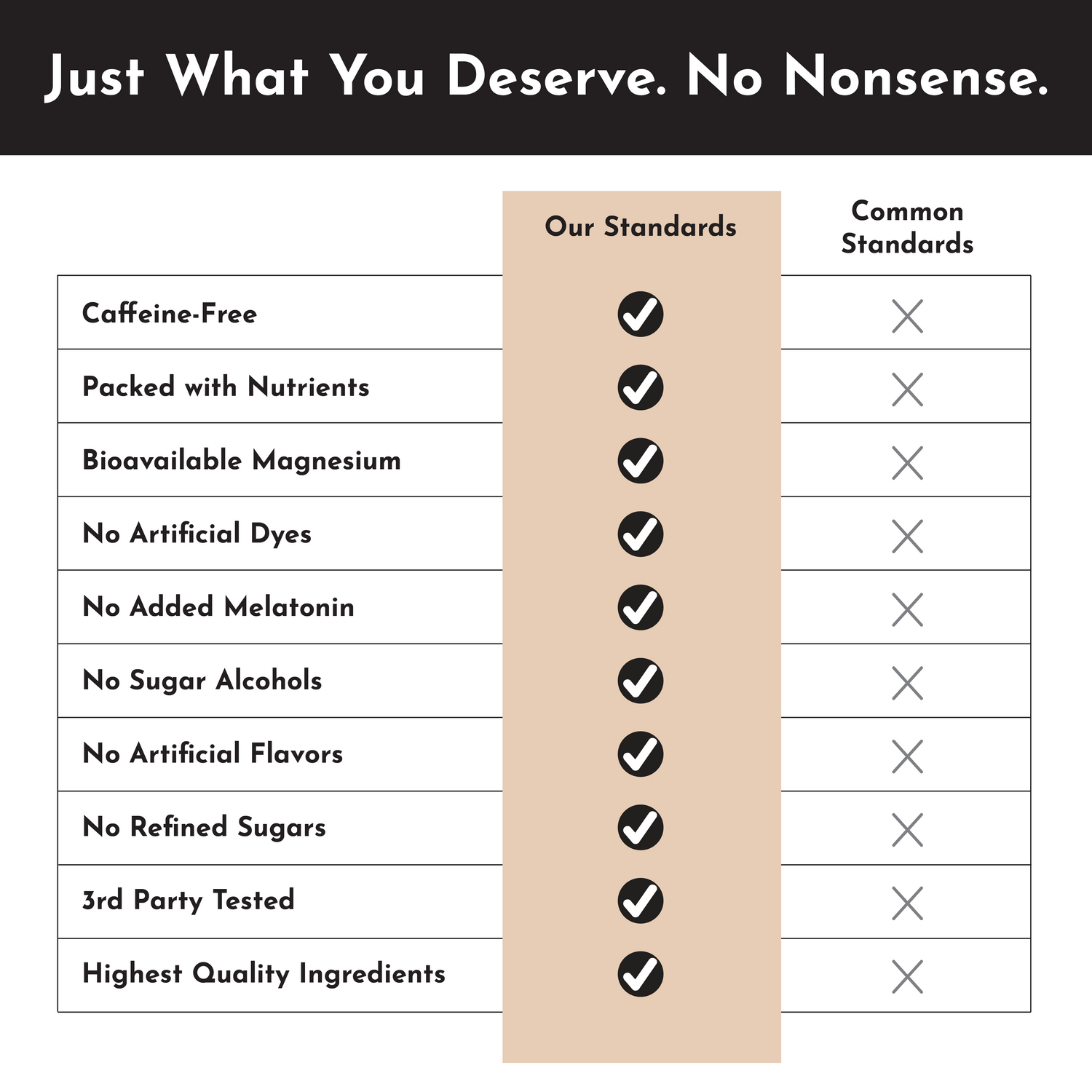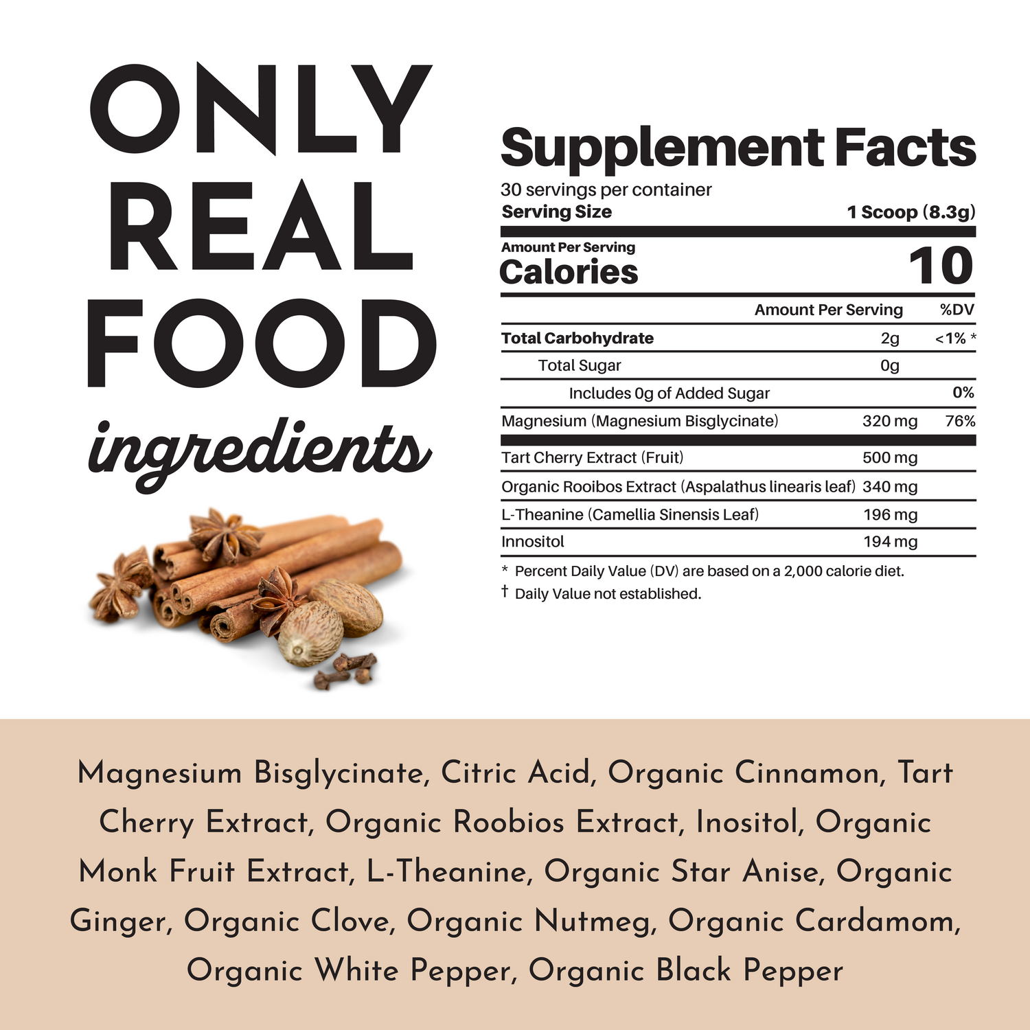 Relax and unwind with our seasonal Chai Nighttime Relax drink. Packed with magnesium—a vital nutrient often deficient in many individuals—this soothing, caffeine-free drink can help with regulating the nervous system, promoting relaxation, and supporting better sleep. Plus, with ingredients like inositol and tart cherry extract, it offers even more sleep support.