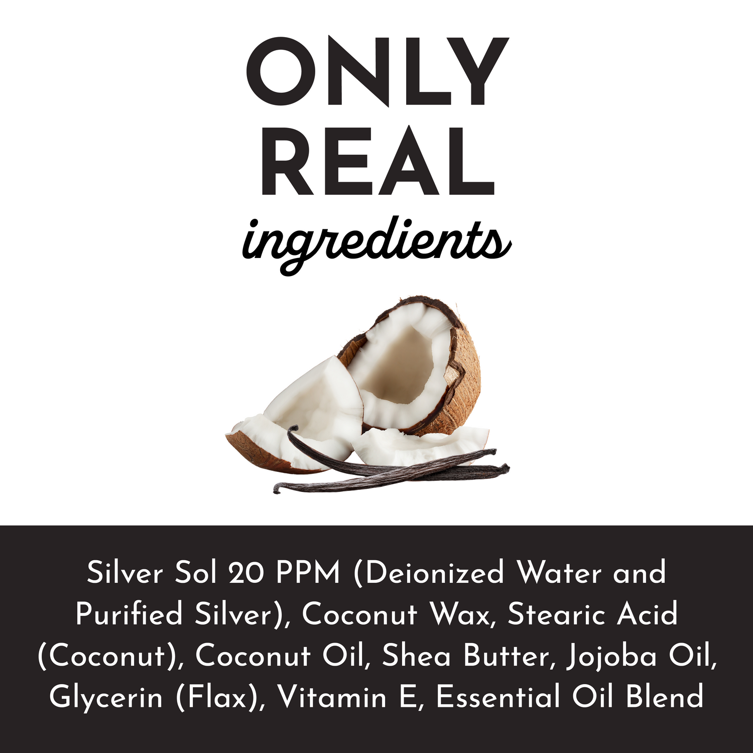 Silver Sol 20 PPM (Deionized Water and Purified Silver), Coconut Wax, Stearic Acid, Coconut Oil, Shea Butter, Jojoba Oil, Glycerin, Vitamin E, Essential Oil Blend