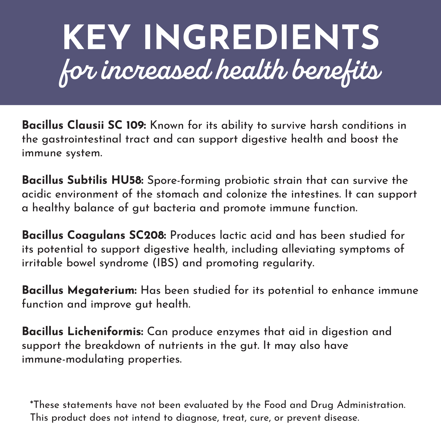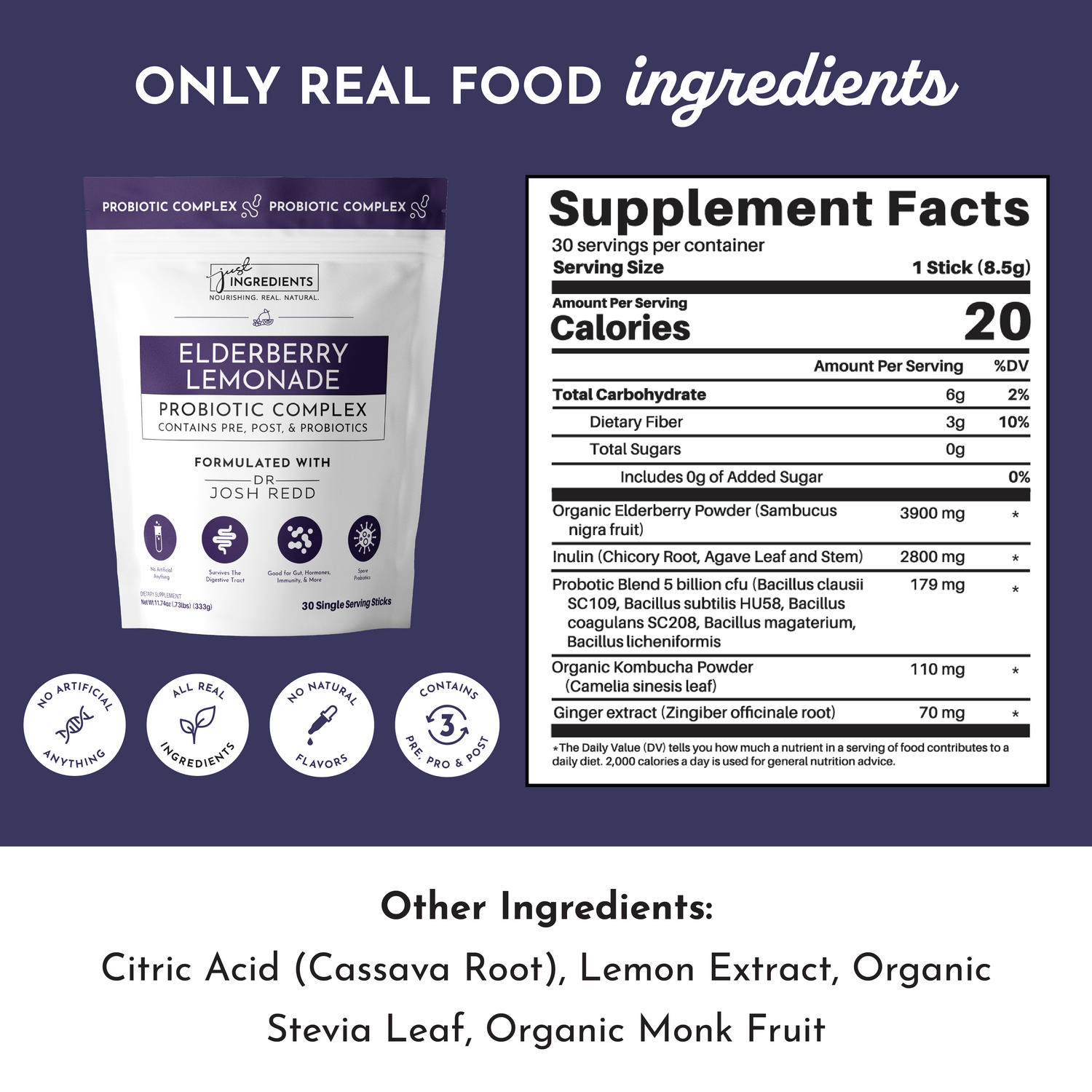 Just Ingredients Probiotic Complex is a 3-in-1 blend of prebiotics, probiotics, and postbiotics designed to support gut health, digestive balance, and immune function.* It delivers 5 billion CFUs from spore-forming probiotic strains—carefully selected for their ability to survive digestion and reach the gut where they’re most effective.* Formulated with real elderberry and lemon to support your everyday immune health, this fruit-flavored blend contains no artificial flavors, sweeteners, colors, or natural flavors.*