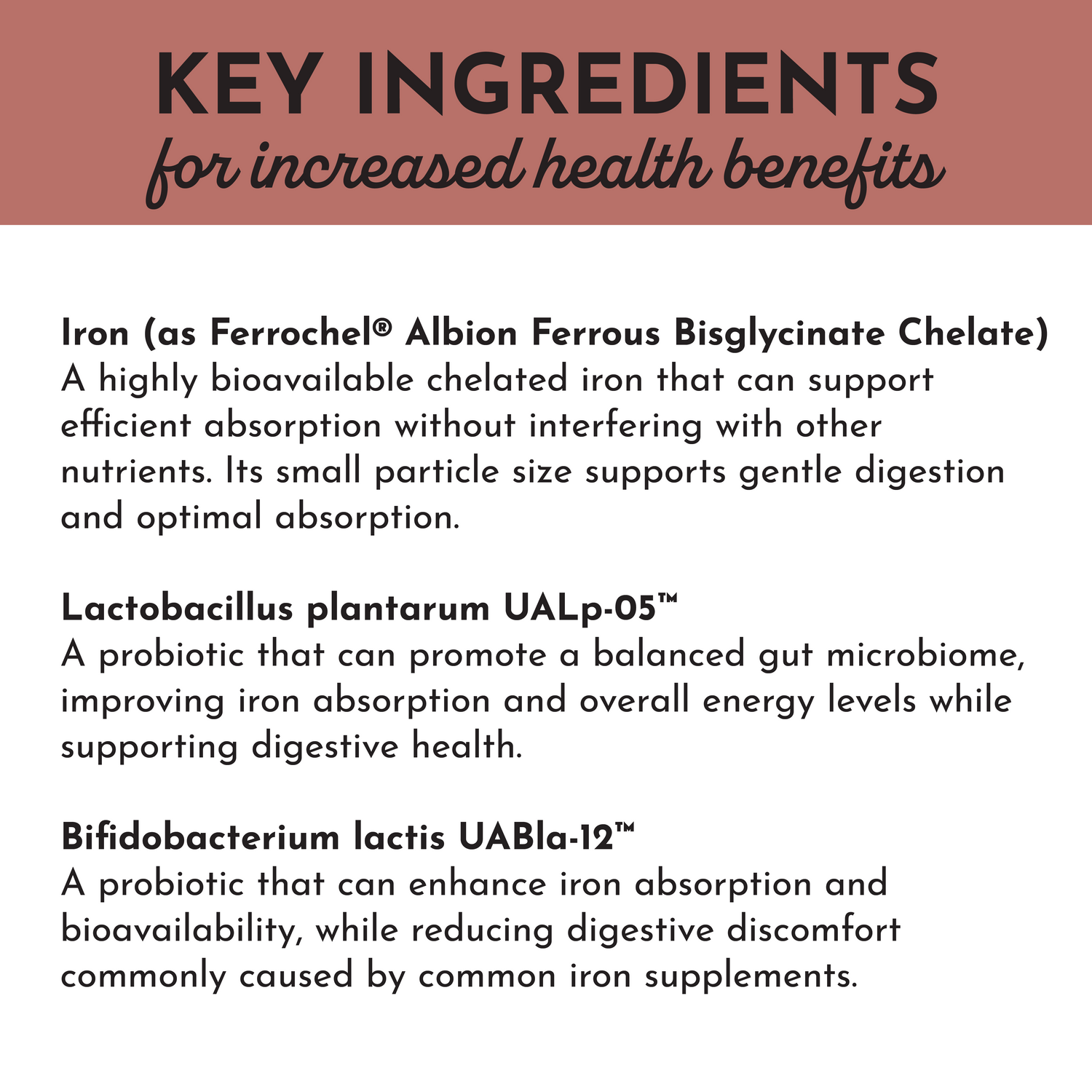 Just Ingredients Iron Complex supports healthy iron levels and helps promote energy, vitality, and hemoglobin function—the protein responsible for carrying oxygen throughout the body.* It features Ferrochel®, a gentle, chelated form of iron designed for enhanced absorption and digestive comfort. The formula also includes vitamin C, which is essential for iron absorption,* a 2-billion CFU probiotic blend to support digestion and gut health, amino acids to promote healthy hemoglobin levels, and BioPerine® (black pepper extract) to help enhance nutrient uptake.*
