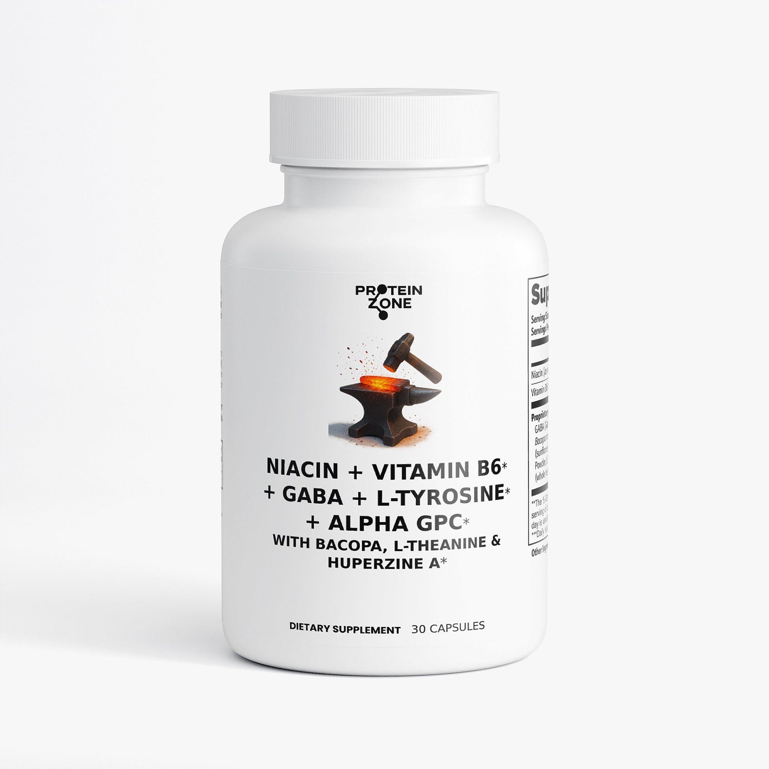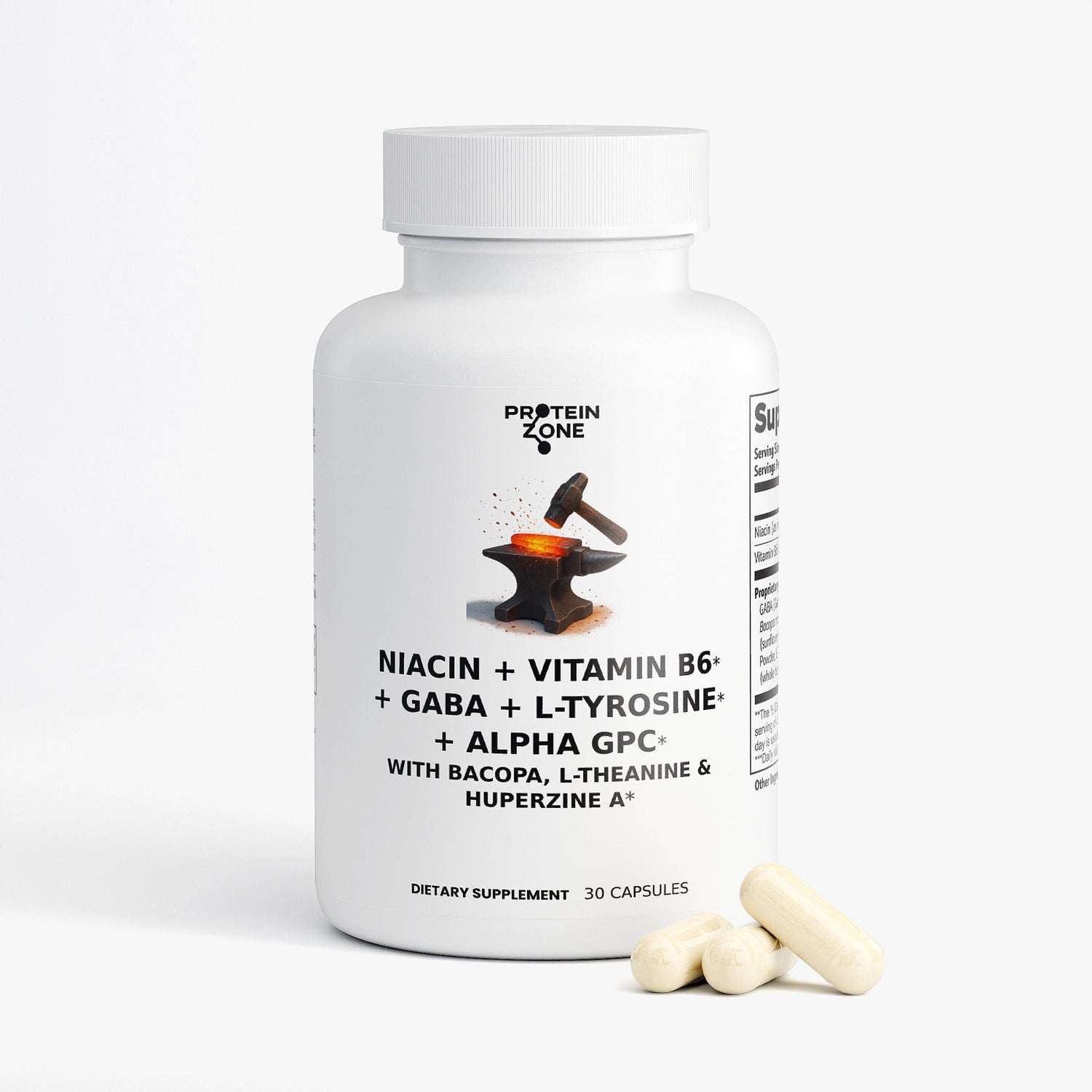 Niacin (as niacinamide); Vitamin B6 (as pyridoxine hydrochloride); GABA (Gamma-Aminobutyric Acid), L-Tyrosine, Caffeine, Bacopa monnieri Extract (whole herb), Phosphatidylserine 20% (sunflower), Alpha GPC (Alpha-glycerylphosphorylcholine) Powder, L-Theanine, Huperzine A 1% (Huperzia serrata) (whole herb).