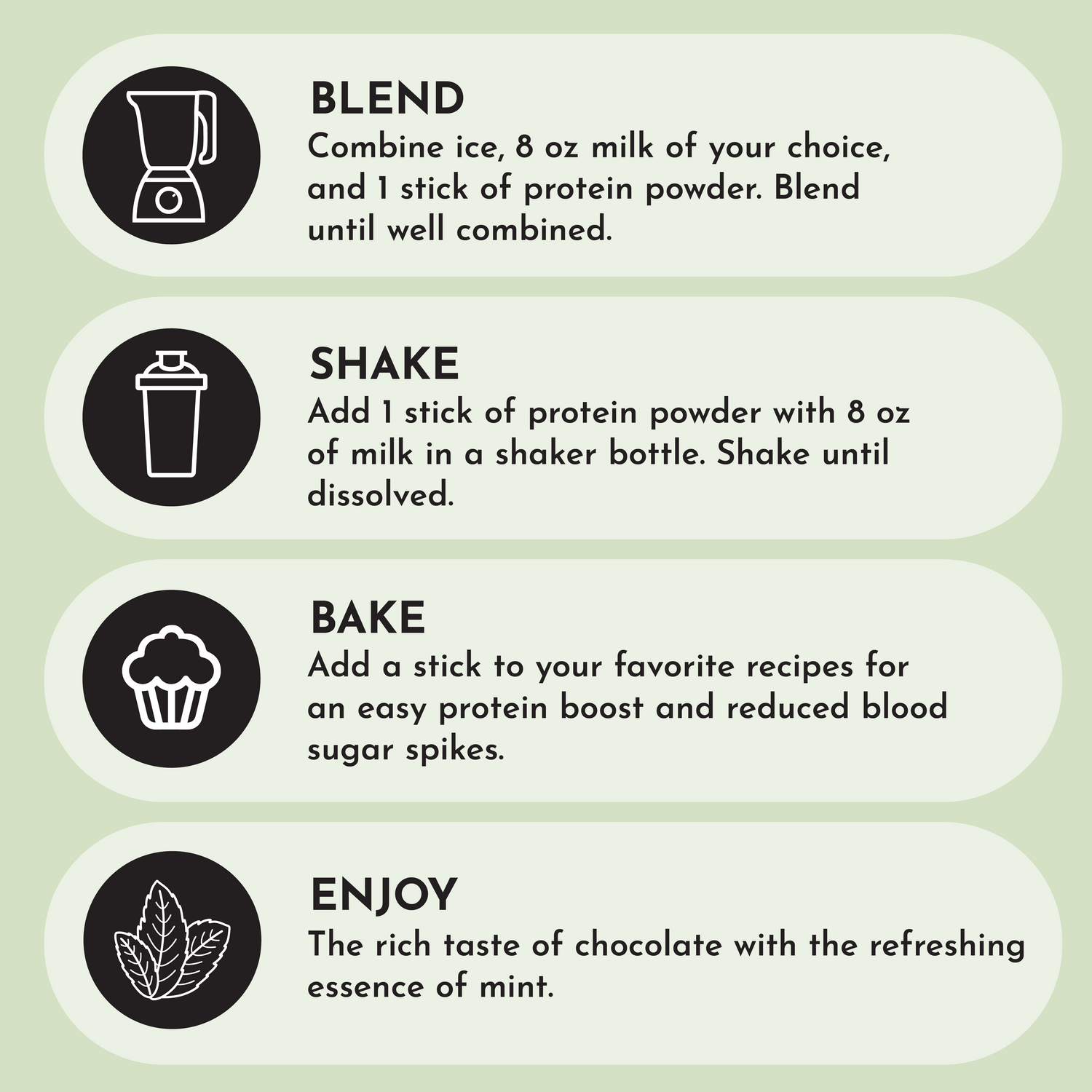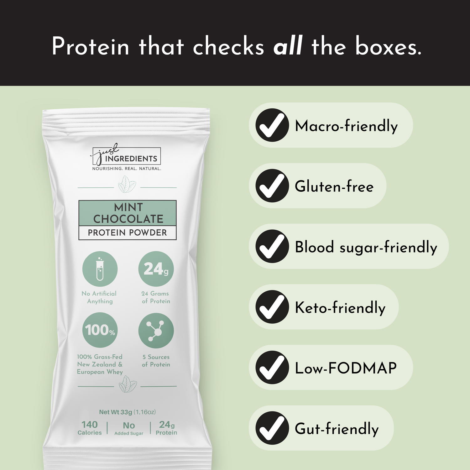 A creamy, delicious blend of the classic flavor combo, mint and chocolate. Protein powder made with five different protein sources and flavored without artificial sweeteners or sugar alcohols. Made with non-denatured 100% grass-fed whey from New Zealand.