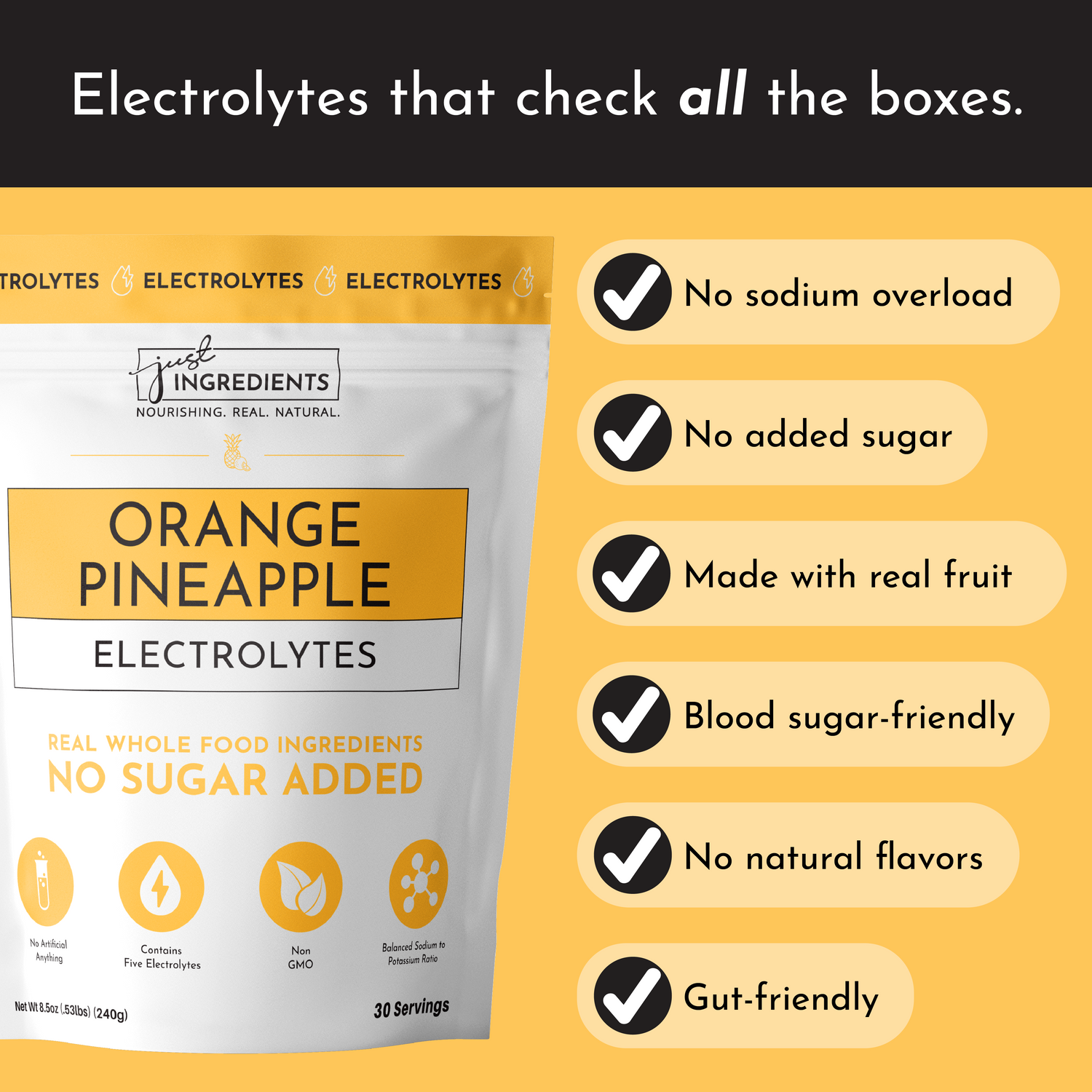 These bright, citrusy, and sweet Orange Pineapple Electrolytes are made with five different sources of electrolytes and flavored without artificial sweeteners or sugar alcohols. With a balanced 3:1 potassium to sodium ratio, you’ll be able to enjoy optimal hydration without excessive sodium levels. Whether you're an athlete or simply seeking optimal hydration, choose our electrolytes for a natural and refreshing experience that fuels your body.