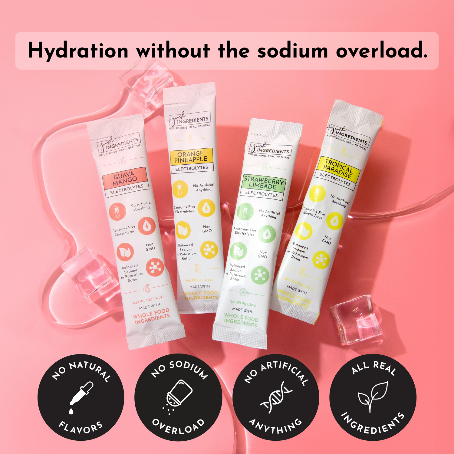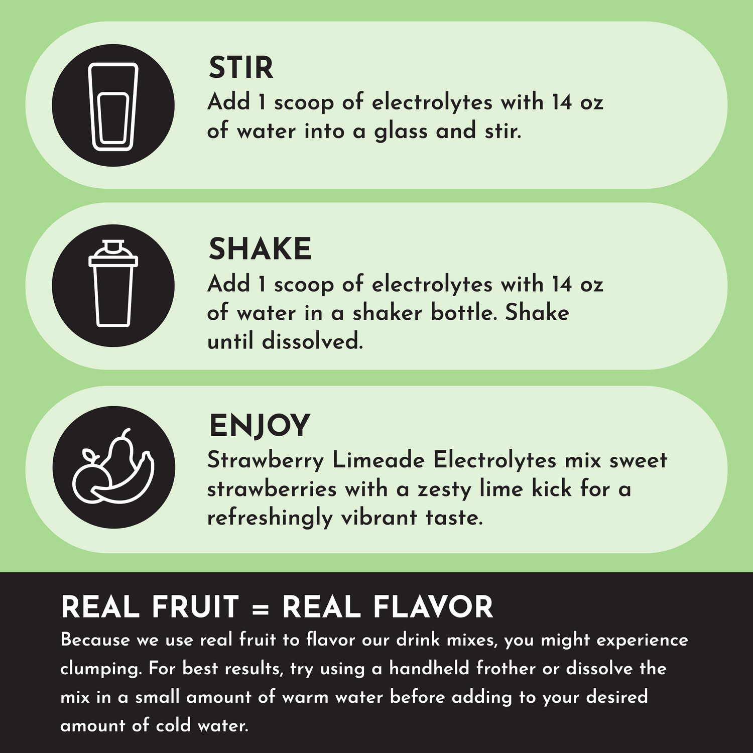 Zesty and sweet Strawberry Limeade Electrolytes are made with five different sources of electrolytes to support your hydration needs. With a 3:1 potassium to sodium ratio, you can enjoy balanced hydration without worrying about excessive sodium levels. Plus, they’re sweetened with nourishing ingredients, no artificial sweeteners or sugar alcohols.