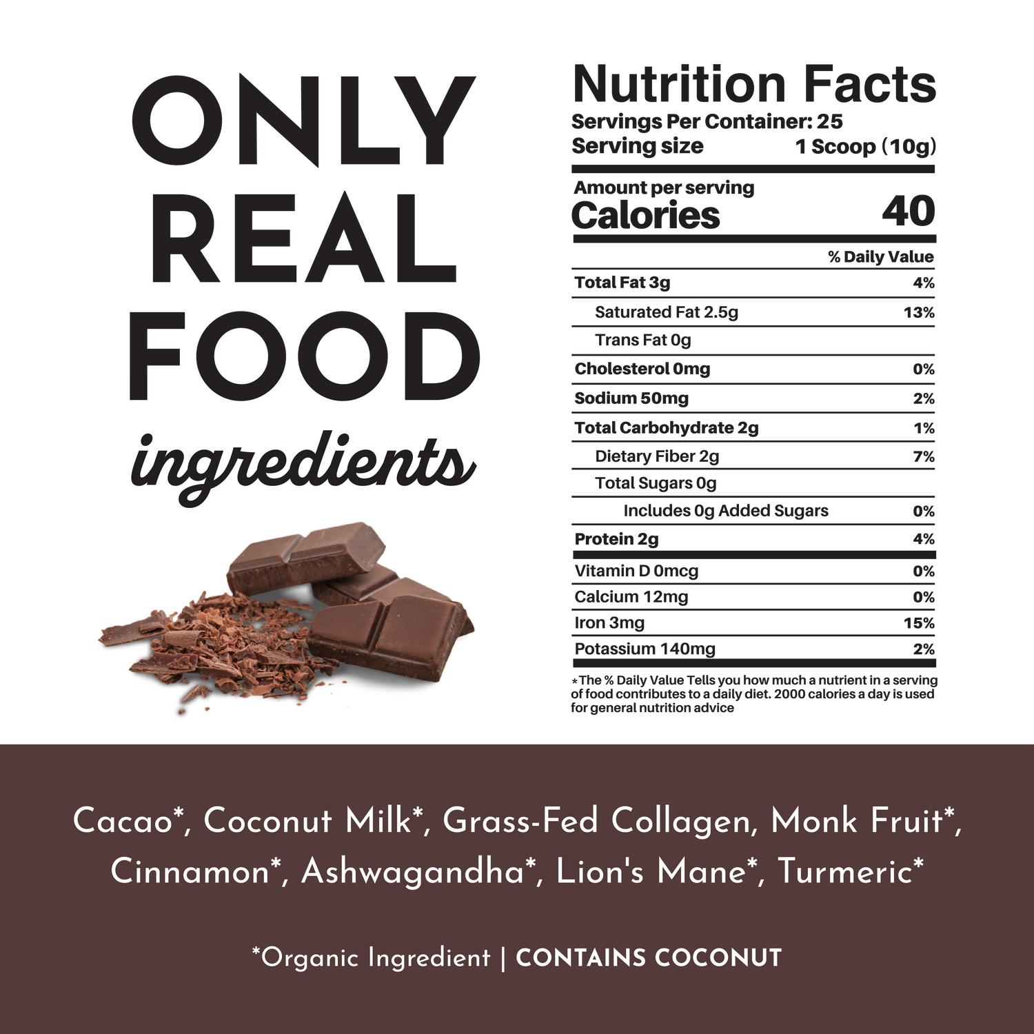 Cacao*, Coconut Milk, Collagen, Monk Fruit, Cinnamon*, Ashwagandha (root) Extract*, Lion's Mane Powder*, Turmeric (root) Extract*