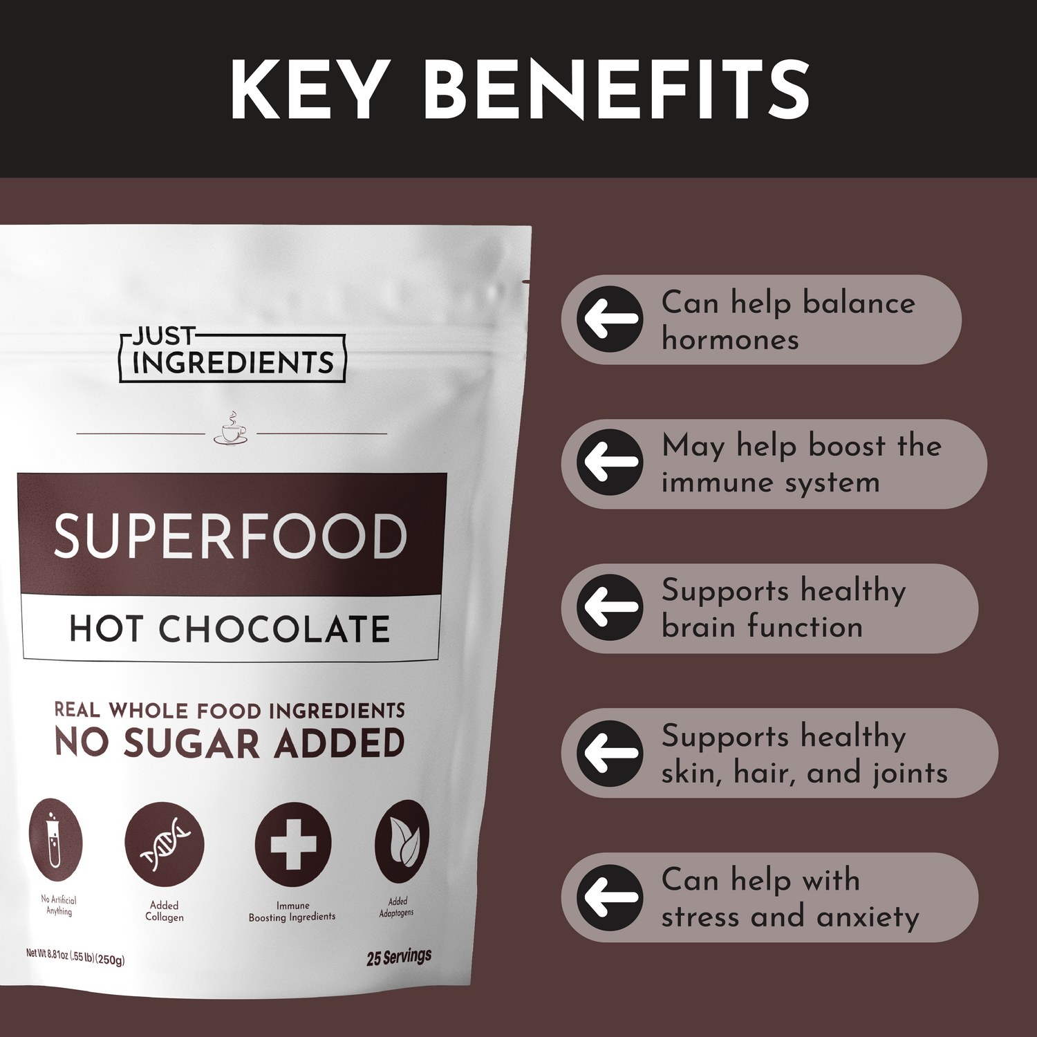 Just Ingredients Hot Chocolate is a 100% natural drink with no added sugar. Our rich hot cocoa blend combined with added adaptogens makes this the ultimate hot chocolate experience that the whole family will love.