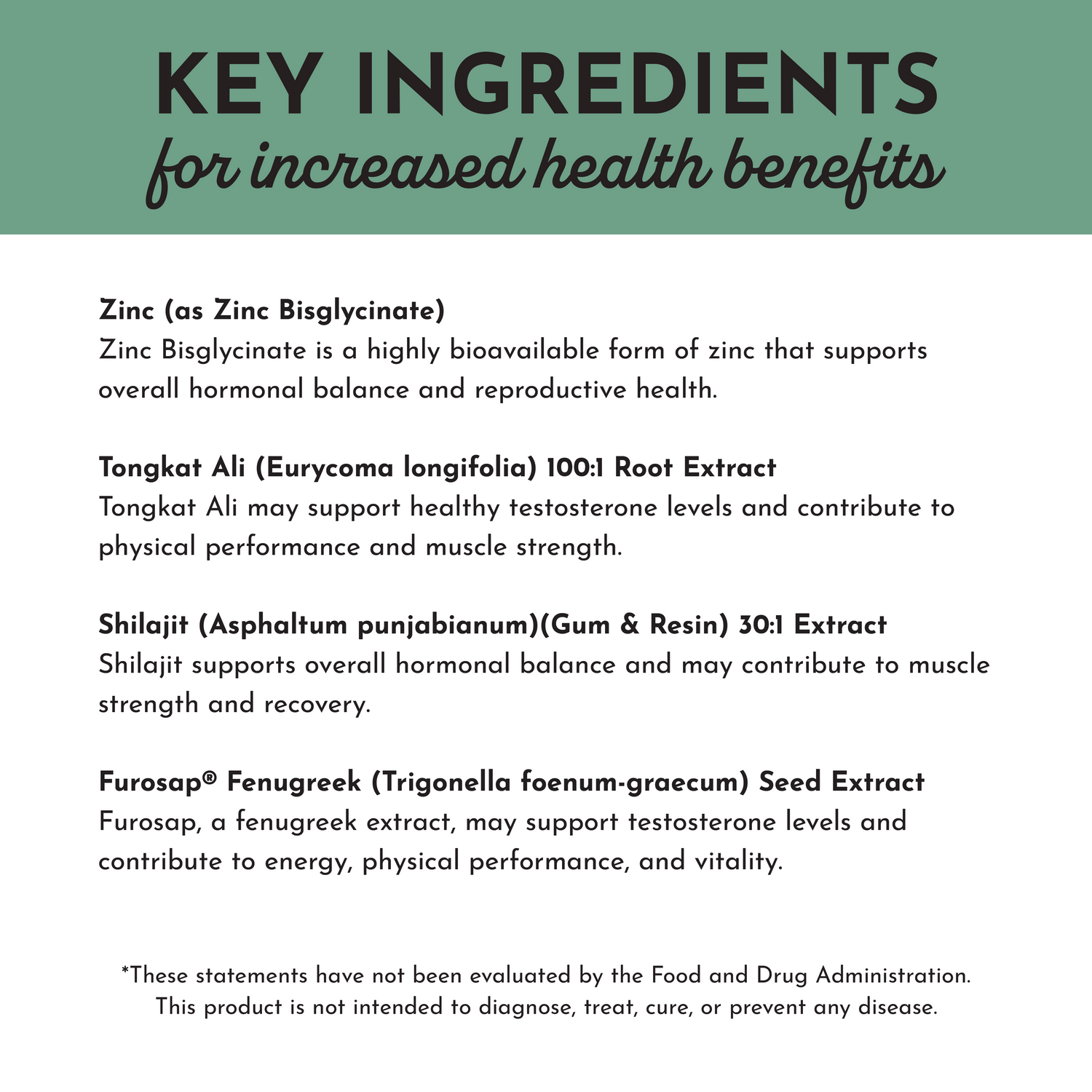 Just Ingredients Testosterone Balance is thoughtfully formulated for both men and women to support balanced testosterone levels, energy, mood, and muscle strength.* It features KSM-66® Ashwagandha—a high-concentration, full-spectrum extract clinically studied for supporting male fertility and testosterone levels†—and Furosap® Fenugreek to help maintain healthy testosterone levels.* The formula also includes traditionally used herbs known to support vitality and sexual health, such as tongkat ali, shilajit, and organic Panax Ginseng, along with essential nutrients like zinc, magnesium, and vitamin D as patented VegD3®.*