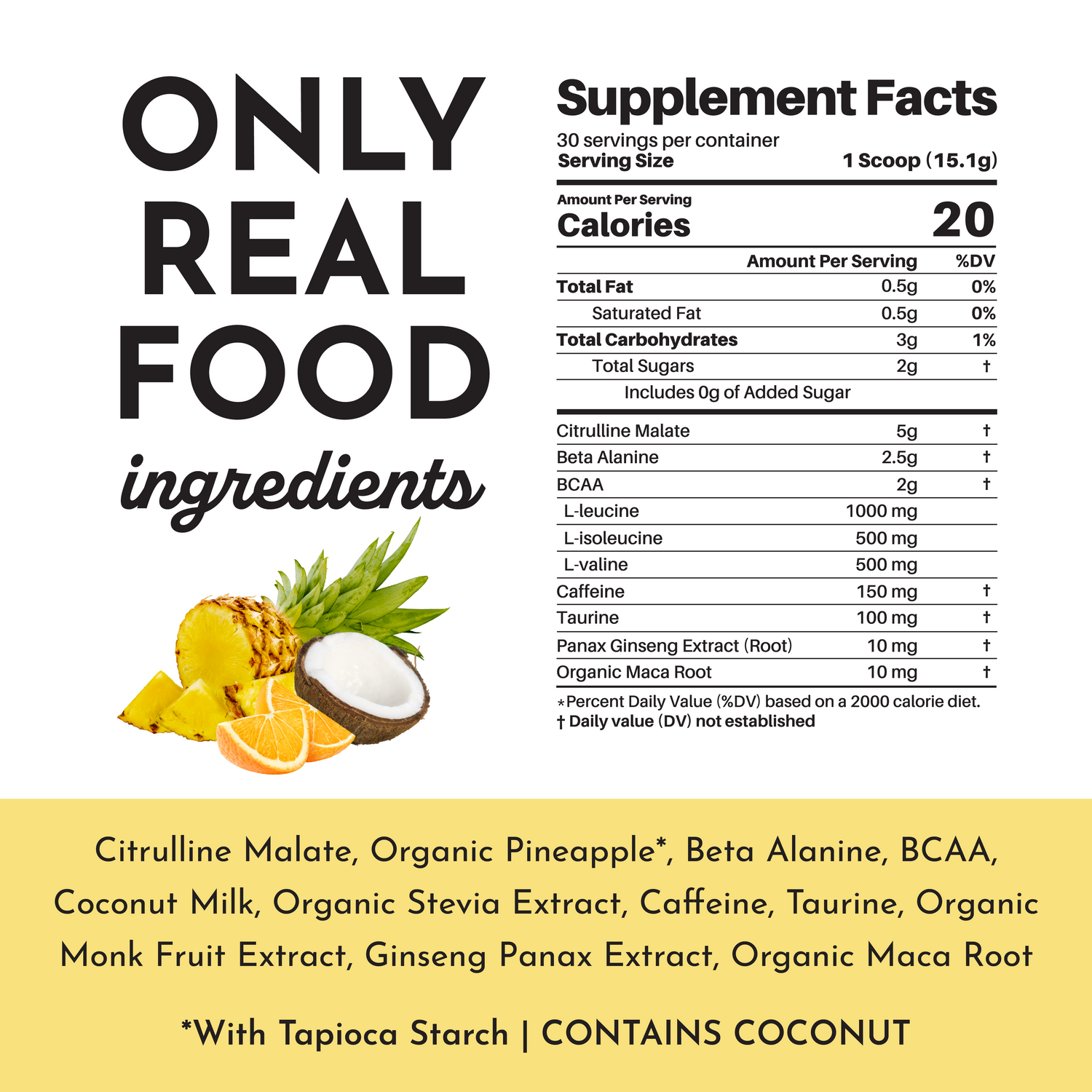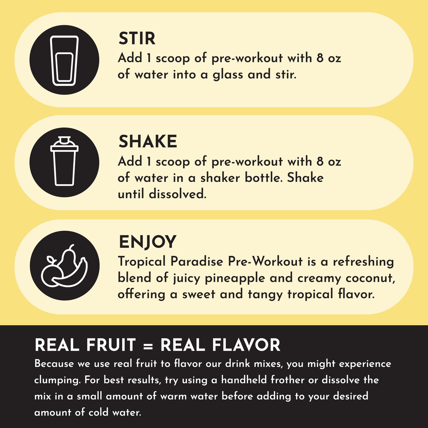 Just Ingredients’ Tropical Paradise Pre-Workout is a 100% natural, clean pre-workout drink that can: