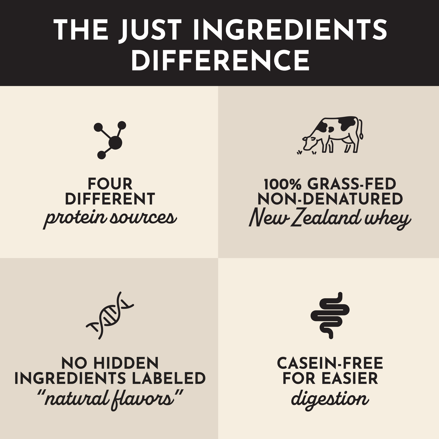 Rich and creamy Vanilla Bean Protein Powder is made with four different protein sources, including 100% grass-fed, non-denatured whey protein from New Zealand. Flavored without artificial sweeteners or sugar alcohols.