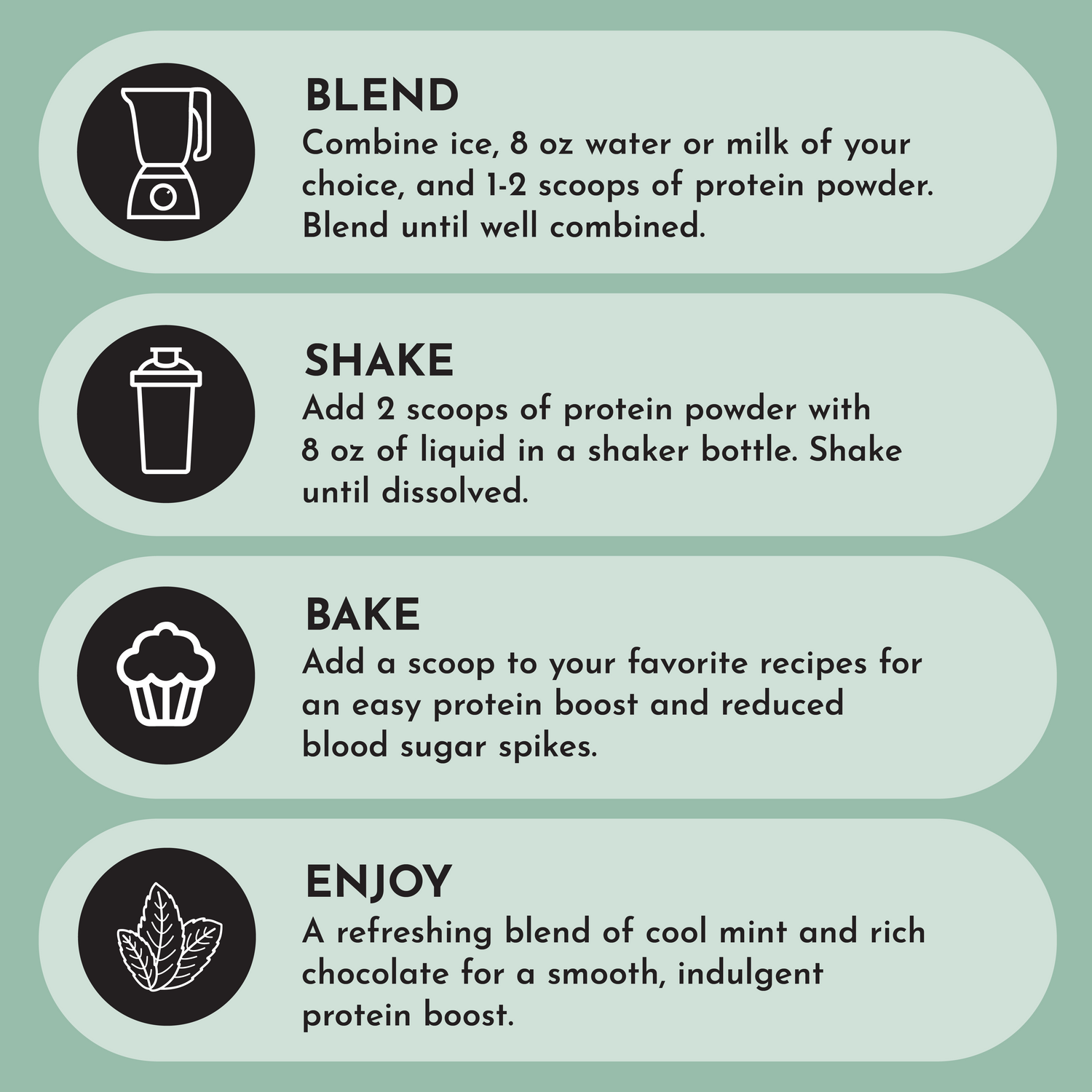 A refreshing mint flavor combines with rich cocoa for a cool, indulgent treat. It’s rich and creamy with a slightly thicker texture than the whey protein, but still smooth and satisfying.