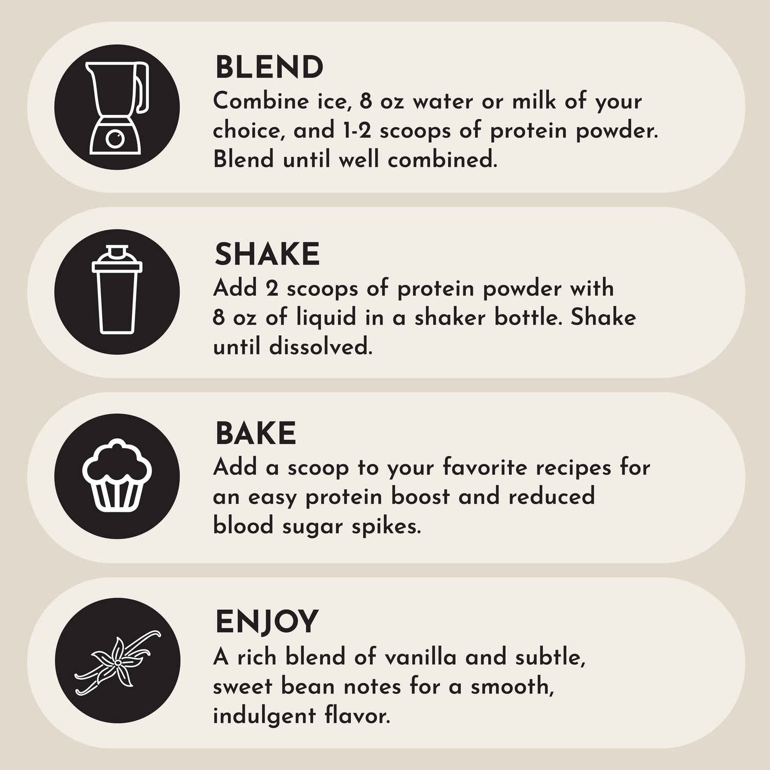 Our Vanilla Bean Vegan Protein combines the smooth, creamy essence of vanilla with a touch of cinnamon warmth, creating a rich, satisfying flavor. It has a thicker texture than the whey protein but is creamy and smooth.